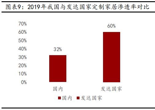 我国定制家居市场渗透率与发达国家市场存在较大差距,未来提升空间广阔。2019 年 我国定制家居的渗透率仅为 32%,而发达国家的定制家居渗透率在 60%附近。随着国 内消费水平的提升与消费观念的改变,未来我国定制家居渗透率的提升空间依然较大。 分品类来看,不同的细分家具类型随着其发展时间、市场接受度的不同而渗透率有所 差异:起步较早的橱柜行业渗透率约为 60%;定制衣柜近年来市场认可度迅速提高, 渗透率随之飙升至 30%左右,而其他柜体渗透率不足 10%。