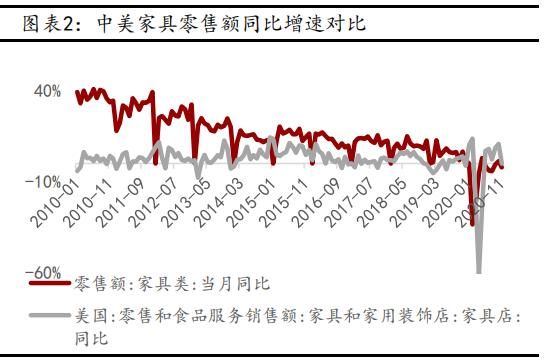 美国家具零售十年来平稳增长,未来中国市场未来有望趋同。根据美国商务部公布的家具店零售同比数据及新建住房销售同比数据显示,两者关联度自 2010 年起开始弱化,尽管美国的新建住房销售同比随房地产周期而呈现较大波动,但美国家具零售额同比增速却在近十年来维持较为平稳的增速。我们认为,新房带来的家具需求对美国的家具零售影响有限,而支撑家具零售额平稳增长的动力在于日常的家具更替需求以及存量房的翻新带来的需求。反观中国市场,未来几年随着房地产红利的逐渐消退, 存量房的翻新需求以及原有住房的家具更新需求也将成为驱动中国家具市场增长的主要力量,而家具与地产行业的关联将弱化,家具零售额增速也将保持平稳增速。