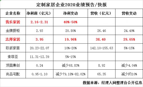有意思的是,春节假期后引爆这一轮战争的我乐家居和志邦,恰恰是目前已披露2020年业绩预告/快报的定制家居企业中,备受瞩目的两家企业。