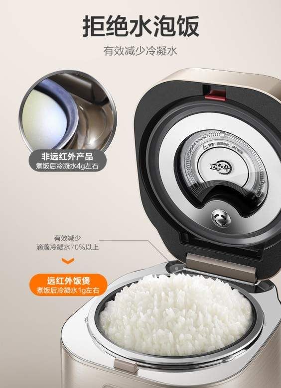 美的和苏泊尔电饭煲哪个好?全新苏泊尔远红外电饭煲在远红外技术的加持下如有神助。远红外穿透加热技术让高温直达米芯,普普通通的白米饭也能焖煮出软糯、喷香的口感和晶莹的色泽,让小朋友停不下口。在采用了远红外技术后,煮饭后的冷凝水减少70%以上,让上层米饭也能保持粒粒分明的状态,避免出现水泡饭的情况。
