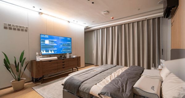 这种“齐全”和“一步到位”在现场得到充分体现。从体验云众播可以看到,5000㎡的店内展示了86个场景方案,且每个场景都有着极致体验。以智慧卧室场景为例,走近床边,智能床头柜正给手机充电,通过蓝牙播放舒缓音乐;桌子上,香薰机正努力营造舒适睡前氛围;躺上床后,智能头枕会联动空调切换睡眠模式,保证空气舒适。