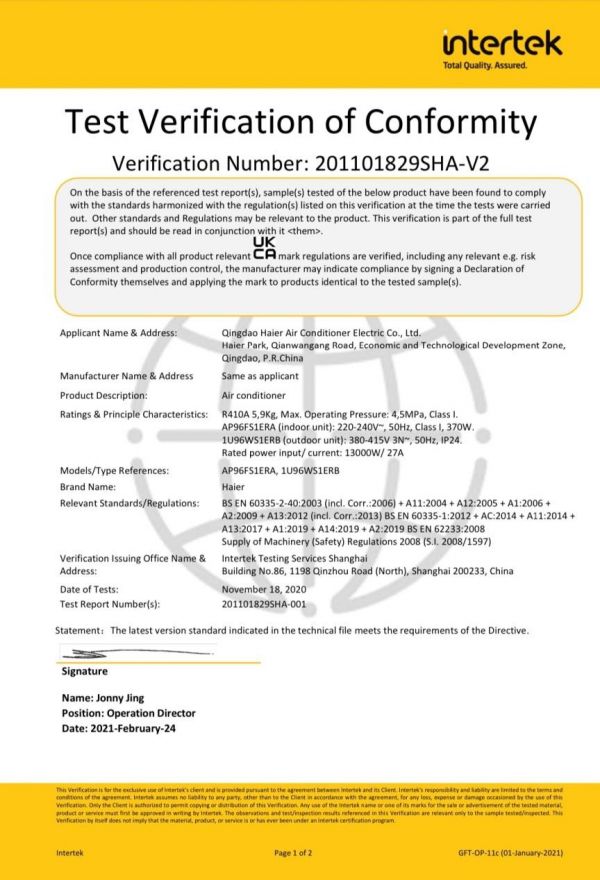 英国Intertek(天祥集团)电子电气事业部华东区相关负责人表示:自上个世纪90年代与海尔中央空调建立合作关系以来,一直致力于为其提供优质的本地化产品测试和认证服务。此次海尔商用空调获得Intertek首张UKCA符合性认证,是双方再一次通力合作高效配合的结果。