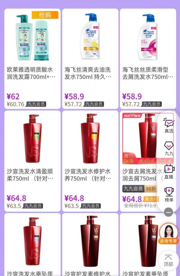 洗发护发,精致由你,生活有我。头发就好比女人的第二张脸,“稻草发”、“雪花头”和“大油头”,总是会给形象打折扣,所以随时随地都要注意下形象来稳定局面。欧莱雅透明质酸水润洗发露,原价68元,现抢购价62元;沙宣去屑洗发水水润去屑,全网低价71.9元,现真选价只要64.8元;海飞丝丝质柔滑型去屑洗发水,真选价只要39.9元。品类这么多,总有一款适合你发质的洗发水。