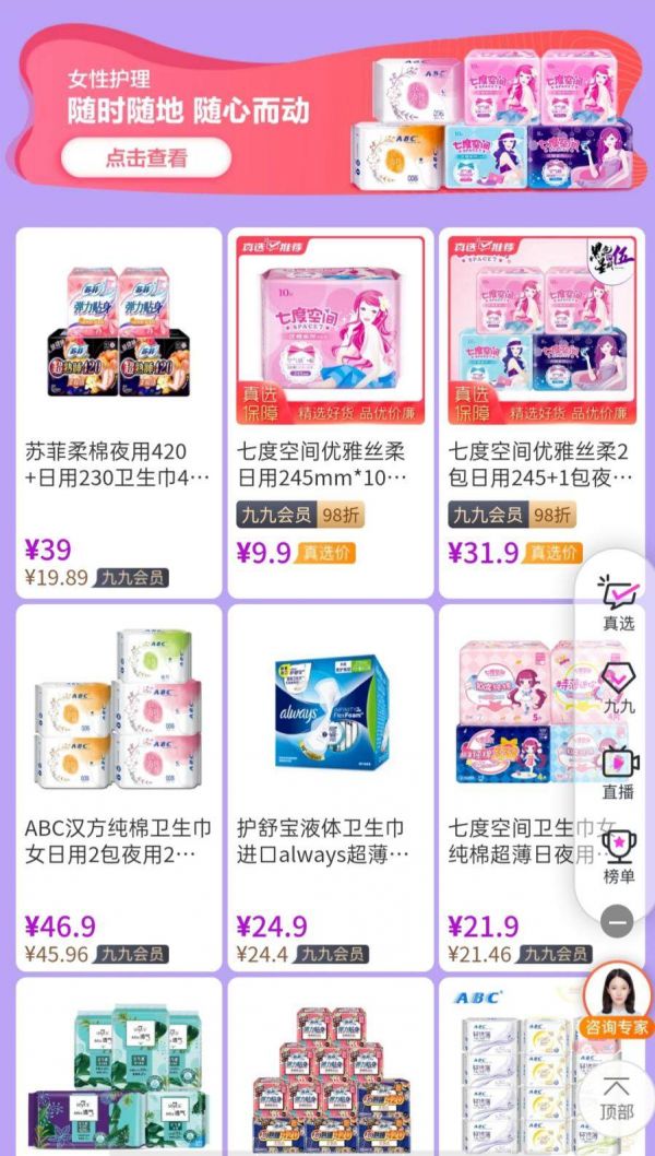 女性护理,随时随地,随心而动。大牌女性个护,让你告别烦闷,那几天,给你身体期待的安全感。七度空间优雅丝柔日用,低至9块9;苏菲柔棉夜用+日用套装,活动价39元;ABC汉方纯棉卫生巾组合装,活动价46.9元;月月舒卫生巾52片组合装,活动价29.9元。反正每个月都要用的,而且九九会员还享折上折,集美们现在可以趁着放价日常囤货了。