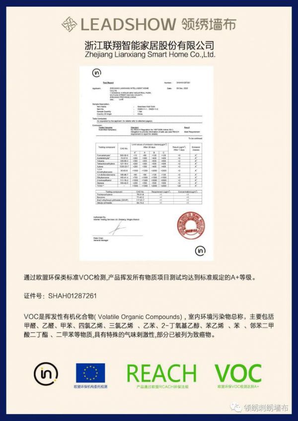 1、品质需要标准。墙面能大面积的与室内空气接触,因此墙面装饰材料的好坏也是影响室内有害物质是否超标的重要因素。领绣拥有儿童级安全产品认证,通过欧盟SVHC清单检测以及环保类标准VOC检测。众所周知,欧盟对于环保检测十分严苛,能过线的企业当然更受消费者信赖。基于对环保性能的高度重视,中国墙布十大品牌领绣将墙布样品提交第三方实验室检测,报告显示,领绣墙布对欧盟REACH法规所关注的211项有害物质均未被检测出,且领绣墙布挥发所有物质项目测试均达到标准规定的A+等级,真正从源头做到杜绝环保危害,用超高标准打造品质基石。