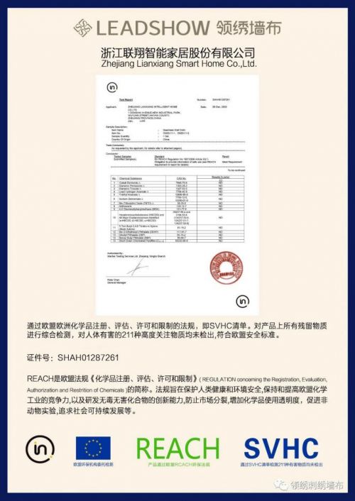 1、品质需要标准。墙面能大面积的与室内空气接触,因此墙面装饰材料的好坏也是影响室内有害物质是否超标的重要因素。领绣拥有儿童级安全产品认证,通过欧盟SVHC清单检测以及环保类标准VOC检测。众所周知,欧盟对于环保检测十分严苛,能过线的企业当然更受消费者信赖。基于对环保性能的高度重视,中国墙布十大品牌领绣将墙布样品提交第三方实验室检测,报告显示,领绣墙布对欧盟REACH法规所关注的211项有害物质均未被检测出,且领绣墙布挥发所有物质项目测试均达到标准规定的A+等级,真正从源头做到杜绝环保危害,用超高标准打造品质基石。