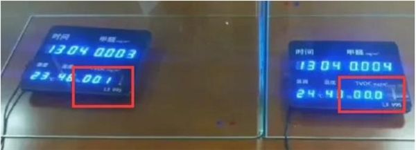 等待十分钟后,咱们看看两个玻璃罩内,TVOC数值有啥变化~