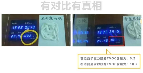 实验结果对比非常明显,西卡魔力胶,低VOC,更加环保安全。