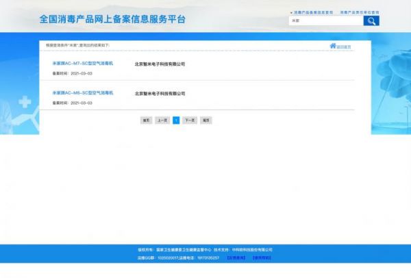 2021年3月,米家空气净化器Pro H(型号:AC-M7-SC)和米家空气净化器3(型号:AC-M6-SC)两款设备获得通过国家消毒器械备案,并在全国消毒产品网上备案信息服务平台获得公示。