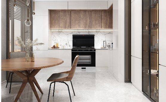 “蒸烤一体集成灶 + 开放式厨房 = 更舒服的生活”。