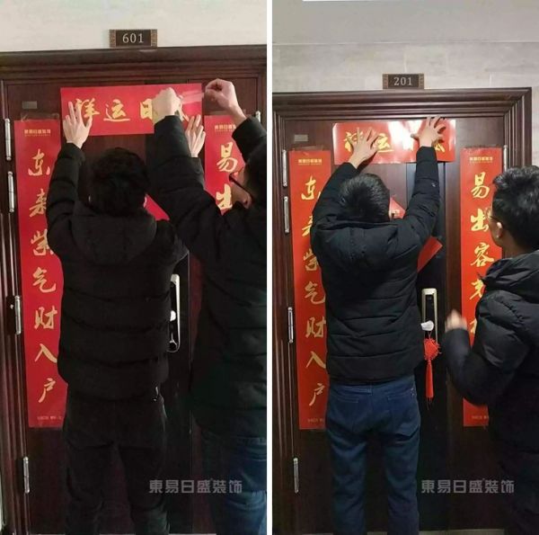 从门、窗、水、电到物料堆放,东易日盛的驻守工人们每逢新年便会对全部工地做彻底排查,杜绝任何可能损害业主利益的事故发生。除了保障每户工地的安全外,工人们还会在每个施工现场外张贴春联,将新年好运与福气带给业主和邻里。