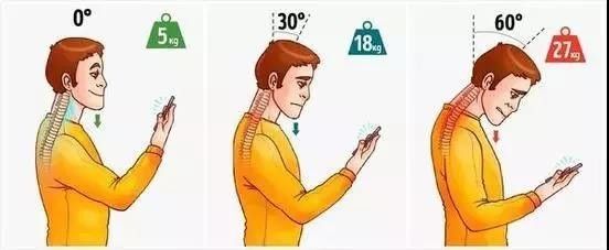 低头玩手机虽然其乐无穷,但是却无形中增加脖子的压力。低头每增加 15 度,脖子的负担就会增加一倍。平时,脖子只要承担头的重量就行了,差不多是 5 公斤。如果低头 30 度,那脖子承受的重量就变成了约 18公斤![2]