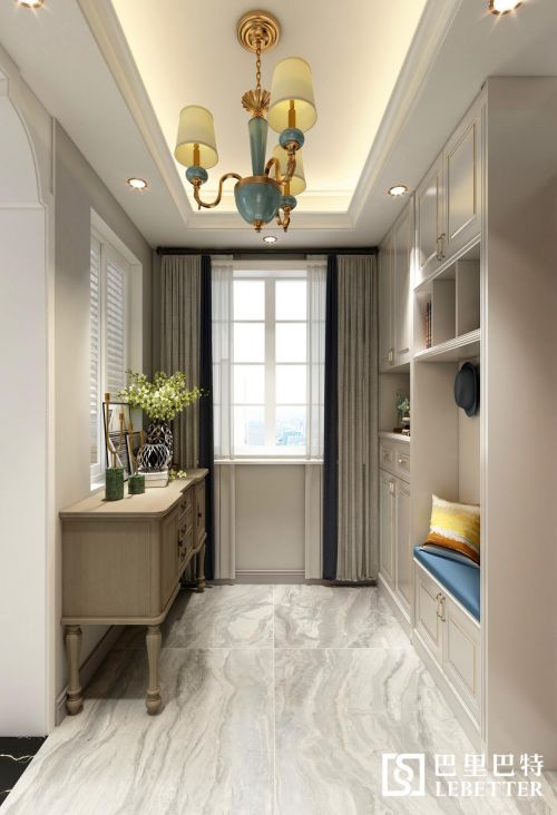 玄关是“第一印象”的创造之地,能够把主人的品位、气质、格调很好地展现出来。选择清新自然的实木美式玄关柜,以及收纳能力强大的壁柜,提升玄关空间的存储能力。实木的质感配合大理石地板冷峻的纹路,低调间展示着一种刚柔并济的浪漫。整体的灰白调柔化了美式家具间的边缘界限,带来婉转、清新的感受。
