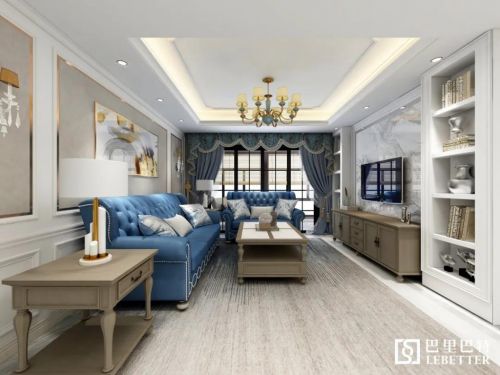 在本案例中,设计师利用明亮的蓝色与沉稳的灰褐色贯穿于家居中。色彩的碰撞,展现了古典美式的现代演绎。当俏丽的色彩搭配,邂逅优雅的美式设计,丰富的质感无需过多的点缀装饰,便可让人感知那股华美而悠扬的独特感受。