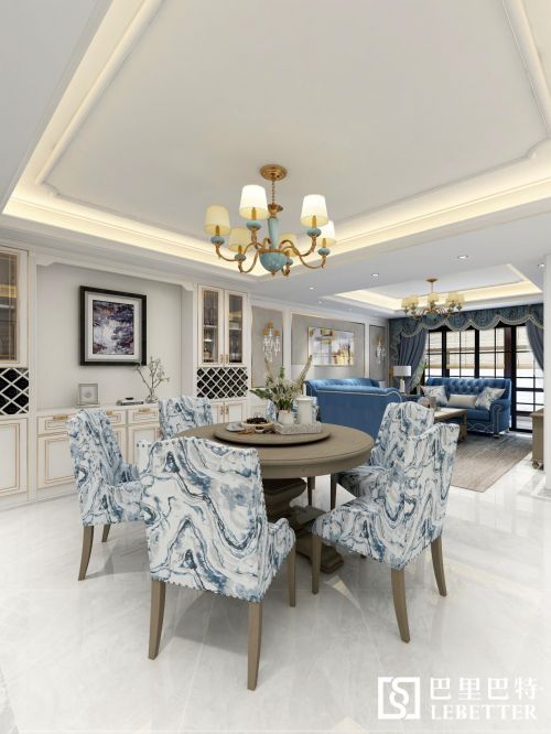 餐椅白蓝相间的花纹,犹如海水般,绵延起伏,皱起波澜。搭配灰褐色的实木圆餐桌,简约大气凝结其中,带来优雅而华贵的气质。