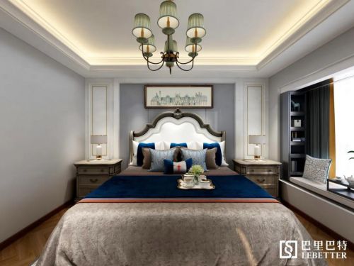 主卧室以华丽高贵的主题承接装饰搭配的核心。美式床具,采用实木与皮质的搭配,结合精细的线条与雕花设计,泰然自若地展现高贵优雅的皇家范。床品选用丝绒、绸缎的亮丽质感以及典雅大气的蓝、棕配色来渲染出奢华古典的美式情调。实木床头柜,以沉稳的灰褐色调,还原自然的本色。缔造出一份古典雅韵,在视觉上呈现舒缓之感。