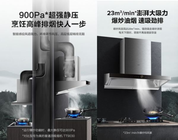 烟机发生油烟异味倒灌,是现代家庭厨房烹饪遇到的又一难题。尤其是一到饭点,厨房甚至家里可能都会漂浮着各种油烟异味。这其实是由于做饭高峰时期公共烟道压力过大油烟倒灌导致的。美的E90飞阁拥有900Pa的超强静压,可以智能感应烟道阻力,精准调节风压,加上可高达23m³/min的爆炒风量,就算是烹饪高峰,都能强劲吸走油烟,实现畅排无阻。