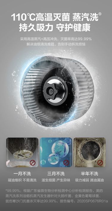 追求品质生活的现代人一直注重饮食健康,烟机作为重要的现代厨电,其洁净状况也关乎到烹饪卫生的好坏。美的E90飞阁独有110℃蒸汽洗自动清洗功能,通过高温蒸汽+高压冲洗结合的方式,能有效杀灭烟机中高达99.9%的细菌。智能提醒功能还可定期提醒家人进行自动清洗,在解决手动拆洗烟机的麻烦之余,还有效保持烟机的洁净卫生,守护全家人的健康。