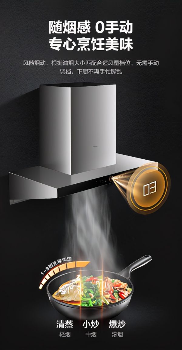 在智能感烟控烟方面,美的E90飞阁也有独特的“黑科技”。随烟感科技能根据油烟大小精准匹配风量档位,实现1-8档的无极调速。无论是清蒸、小炒甚至爆炒,油烟都“无处可逃”。免去手动调节烟机的麻烦,让热爱烹饪美食的现代人,能彻底解放双手,下厨一展身手时都不再手忙脚乱。