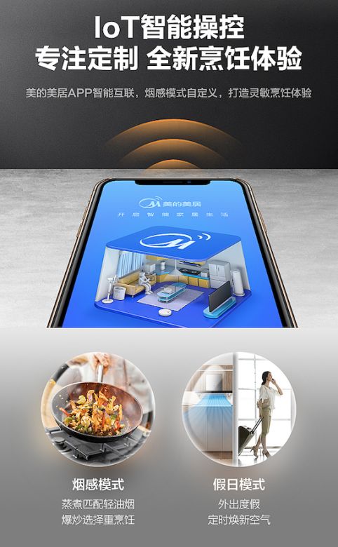 继承美的全屋智能家居的特点,美的E90飞阁在智能互联方面也独显智慧。点开美的美居App,就能实现远程开关、调节风量等各种操作。在烹饪时,通过IoT智能操控还可以远程设置烟机的烟感模式,蒸煮匹配轻油烟模式,爆炒则可匹配重烹饪模式。外出度假时,还可设置烟机定时焕新空气模式,保持厨房空气流通。不同模式均可以随心自定义,打造全新的烹饪体验。