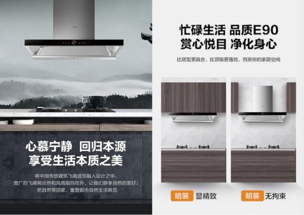 此番焕新上市的美的E90飞阁,在外观上将中国传统建筑飞阁造型融入设计中。无论是暗装或明装,都能百搭你的厨房家居空间。如同宽广的飞阁将炎热和风雨阻挡在外一样,美的E90飞阁也悉心为现代家庭解决了由油烟带来的烹饪困扰,带来如自然般的美好烹饪享受,让每个家庭都能享受到生活的本质之美。