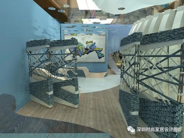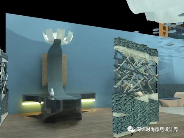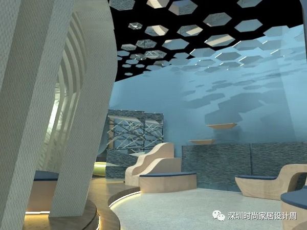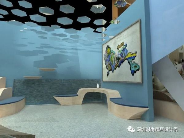 大小不一的窗纱堆叠组合而成的前台、灯塔形状的会议室、镜子鳞片装饰的空间吊顶、随时敞开或封闭的办公区域、独特寓意的空间装置、海洋元素的空间整体贯穿等,每一处的设计都有着超乎本身的寓意和使命,也代表着深圳职业技术学院-艺术设计学院这一设计团队对于处在深圳这座国际化都市中后浪年轻人乘风破浪、勇往无前的大无畏和创新精神的理解、鼓励。