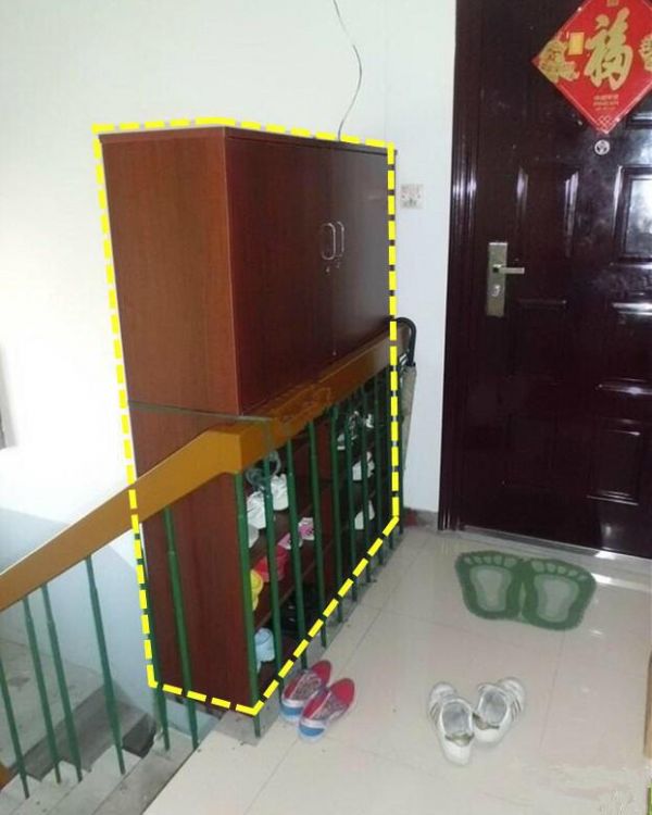 虽然邻居的是吊起来的,但是这样也是占用了楼梯的公共空间了,再说了这么重的鞋柜只用两根绳子这样吊着,连个加固措施都没有,房子再小也不至于这样弄吧,万一掉下去怎么办。