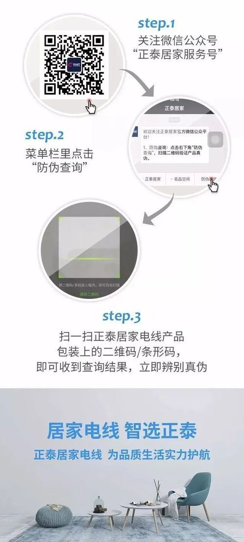 关注微信公众号“正泰居家服务号”,在菜单栏“优质服务”里点击“防伪查询”,扫一扫正泰居家电线产品包装上的二维码/条形码,即可收到查询结果,立即辨别真伪。