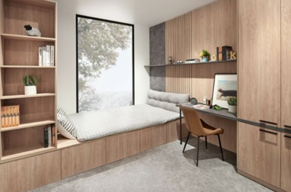 前瞻性的思考,探索对不同家庭需求更具有针对性的空间解决方案,呈现设计巧思,生活更有情境感。比如对于小户型空间,便致力于空间的多元融合,让同一空间尽量承担更多的功能。像后现代工业风I-LOFT的多功能房解决方案:多层书架、床头搁板、书桌搁板,以及榻榻米下方的反弹抽,什么都可以藏;书桌与衣架、衣柜一体造型的轻办公平台,舒适的空间让偶尔的加班事半功倍;榻榻米可以秒变成床,客人临窗而卧,夜晚的静谧尽收眼底。