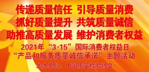 人无诚不立,业无信不兴。2021年3.15国际消费者权益日来临之际,为切实维护消费者合法权益,积极引导企业提高质量诚信自律能力,大力督促企业承诺产品和服务质量主体责任,中国质量检验协会组织2000余家优秀企业开展“3.15”国际消费者权益日“产品和服务质量诚信承诺”主题活动。