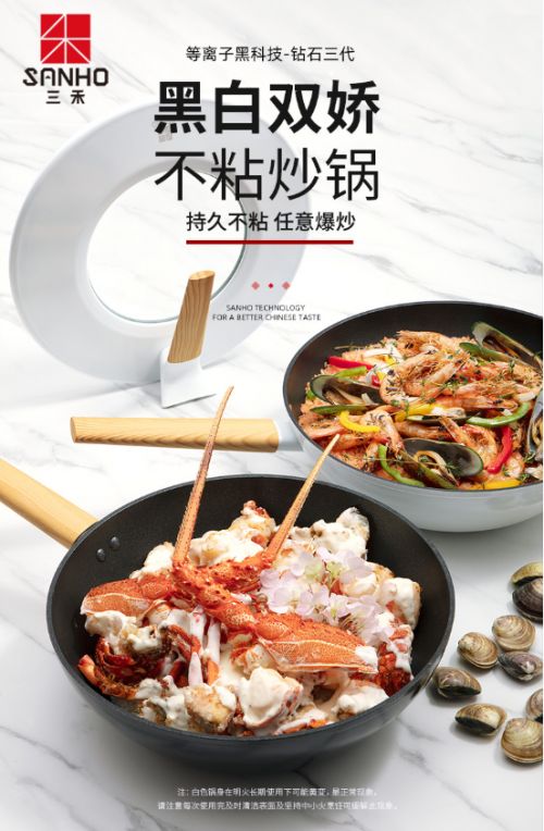 随着人们生活水平的提高,只为消费者解决温饱问题的锅具,已经无法满足当下消费者的精神需求,人们开始从锅具的品质,外表颜值以及售后服务等多个角度思考锅具的性价比。三禾锅具从2004年成立以来,如今已有120多项专利认证,多项专利更是荣获国际大奖,获得国际认证与推荐。由独有“等离子黑科技技术”打造而成的黑白双娇系列不粘锅产品有着钻石级4倍耐磨,3倍耐刮的效果,深受消费者喜爱,多次出现在明星直播间创下不俗的销售成绩。