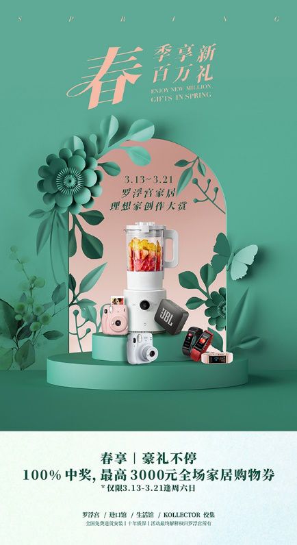 3.13-3.21逢周六日,在罗浮宫自营品牌佛山展厅购买家居产品满5888元起,即有机会赢取最高3000元全场购物券、智能料理机等潮品豪礼,100%中奖!