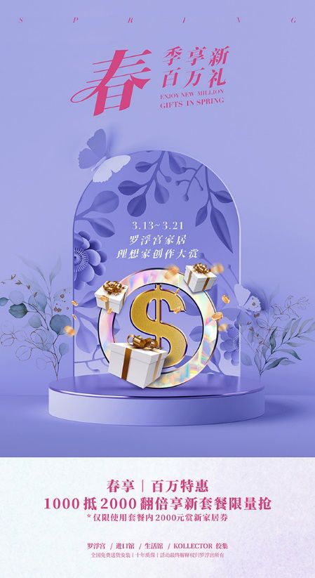 3.13-3.21,登录【罗浮宫家居】小程序,支付1000元即可抢购【春季享新套餐】,在罗浮宫自营品牌佛山展厅畅享2000元家居购物优惠,限量发售,购完即止!(仅限使用套餐内2000元赏新家居券)