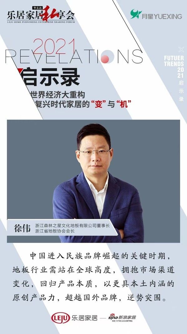 私享会现场,浙江森林之星文化地板有限公司董事长、浙江省地板协会会长徐伟进行精彩发言,新浪家居记者就2021复兴时代家居人的应变之道为主题对徐总进行采访,以下为采访实录: