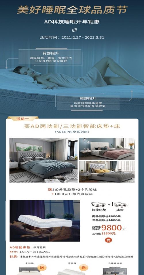 3月21日,是第20个世界睡眠日,AD科技睡眠从3月15日起,开展为期15天的“美好睡眠品质节”活动,不仅有全系折扣与超值换购等多重优惠,3月20日 18:30—21:00,更有2021全新产品 云朵慕思 发布、直播体验,抢先感受未来睡眠科技!