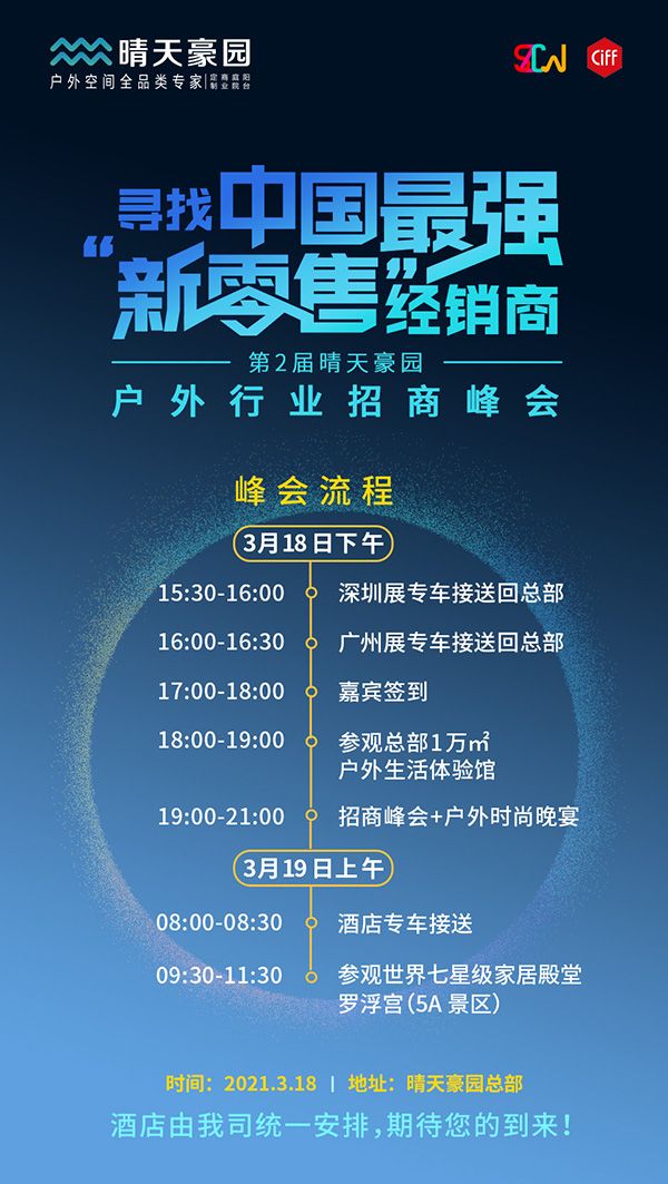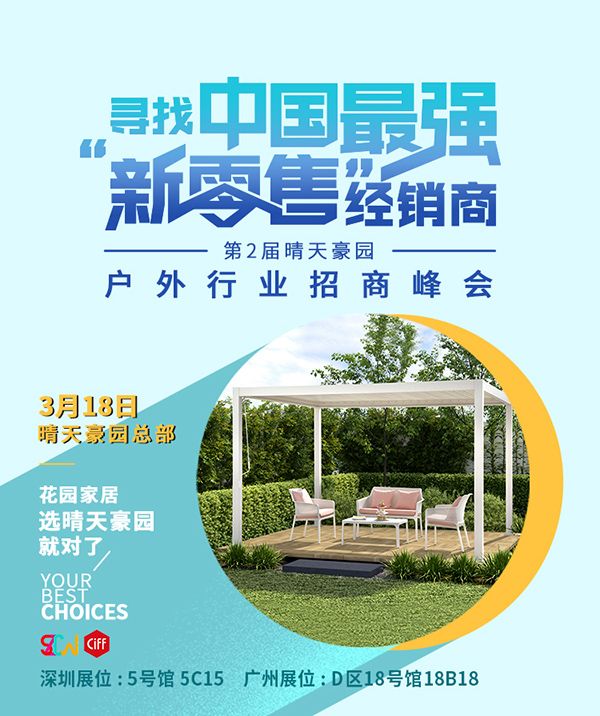 今年财富新风口,你已经洞察了吗?面对家居行业的新风口,又该如何快速抢占价值新高地?改变传统家居营销模式,快速入局新零售。2021年3月18日,晴天豪园第2届晴天豪园户外行业招商峰会在广州市番禺区大石镇河村工业区166号(晴天豪园总部)盛大开幕,邀请众多户外品牌经销商、代表商齐聚一堂,共同把握家居行业脉搏,探究家居行业新趋势、新走向,助力合作伙伴入局新零售,打造中国最强“新零售”经销商。