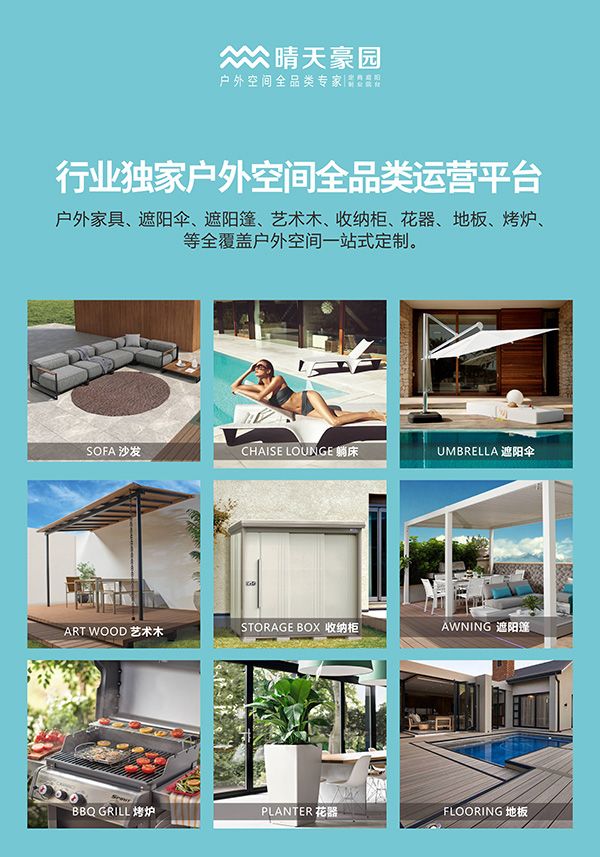 让更多人享受生活,亲近大自然,是晴天豪园的品牌使命。参加峰会的观众们在晴天豪园巨资打造的户外时尚生活体验馆中,真正体验晴天豪园塑造的轻生活、微度假、慢享受的设计理念,这里设有商业户外空间,庭院户外空间,产品展示区等多功能场景体验,前所未有的户外空间体验模式,就在这里开启,户外家具、遮阳伞、遮阳篷、艺术木、收纳柜、地板、花器、烧烤炉等品类,环保舒适、健康安全,使富有艺术、时尚的元素与现代休闲生活完美融合。