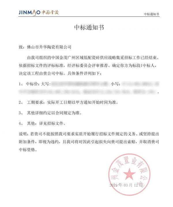 【喜报】升华陶瓷成功中标中国金茂项目!
