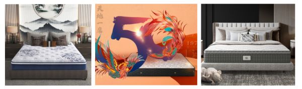 喜临门云鹤抗菌净眠定制款(左)、穗宝50周年纪念款穗月流金(中)、舒达防螨乳胶床垫爱尔兰PLUS(右)