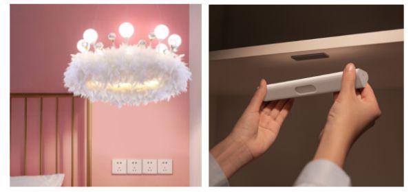 费斯设计师款卧室个性皇冠羽毛吊灯(左)、绿米AQARA智能小夜灯(右)