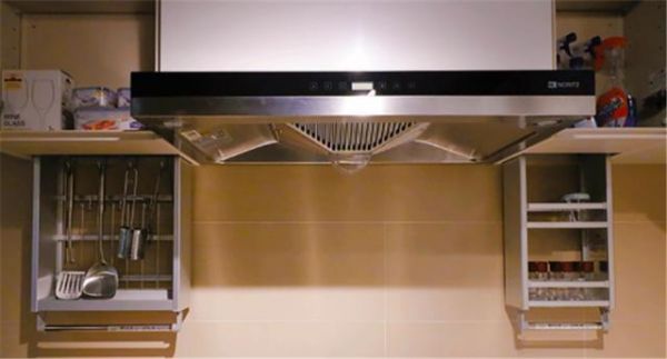 当时安装吊柜时,考虑到日后使用习惯和个人身高,特意把吊柜升级成了可下拉的样式,无论柜子多深,都能轻松拿取到物品。油烟机旁侧的下拉吊柜专门放置调料品,每次炒菜拉下来取用,比弯腰开抽屉还便捷。