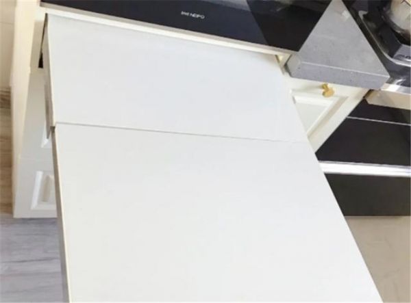 厨房台面专门做了一组隐藏式抽拉台,无形中增加了台面空间,而且占地面积小,和适合小户型厨房。