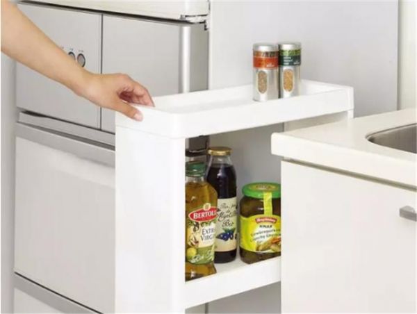厨房冰箱和台面间通常会留有缝隙,这点空间用来放置缝隙柜,瞬间就能让收纳翻倍。选择带轮子的缝隙柜,推拉方便,节省空间。可以将常用的物品放在最上层,不常用的放在底层,方便做饭使用即可。
