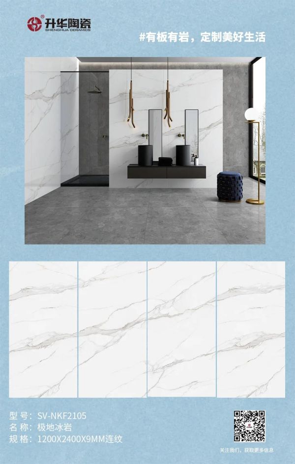 升华陶瓷以自然为灵感,将「极地冰岩」的神韵和光影变幻,注入岩板之中,展现了优雅灵动的姿态,为人们抹掉心中的那份躁动与浮华,将自然的隽美印记在岩板上,唤醒空间中的视觉美感,营造高品质浴室使用体验。