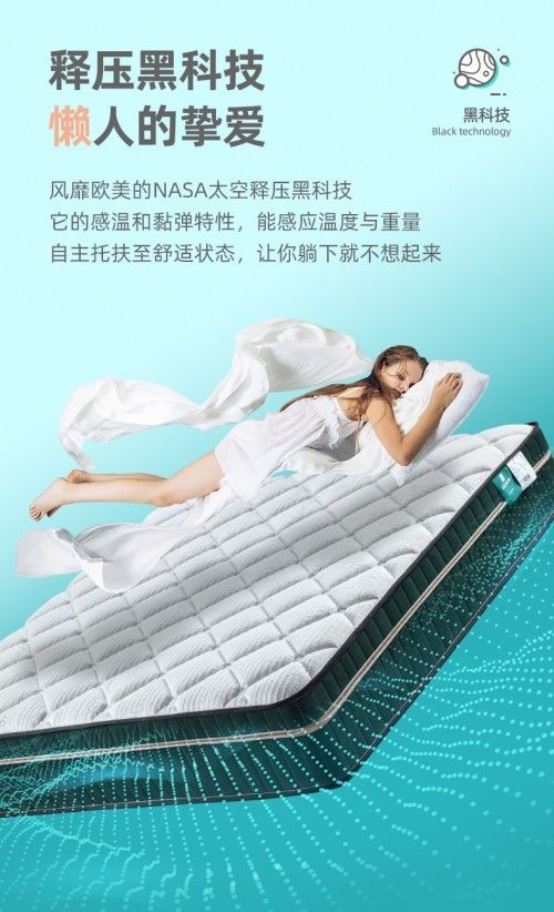 记忆棉床垫是时下风靡欧美的产品之一,拥有良好的慢回弹特性,从而带来对身体的承托到位,完美塑形的特点,这是目前普通乳胶床垫无法做到的,比如雅兰推出的蘭图记忆棉床垫,采用了源自NASA的黑科技——3cm深释压记忆棉。所谓“深释压”,就是利用记忆棉的慢回弹特性,充分吸收身体压力,并贴合身体曲线塑形,达到合理的承托力。