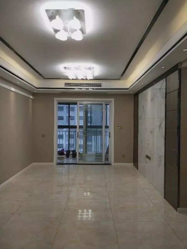 这是客厅,瓷砖做客厅电视背景墙很喜欢!本来打算是要用大理石做客厅电视背景墙了,后来装修的时候超出了预算,用瓷砖做客厅电视背景墙也很有档次!硬装完工,里里外外全都打扫干净,还没有家具也很漂亮,非常喜欢!顶面做了吊顶,安装了中央空调显得很大气,而且贴了金属线条做装饰,灯具也比较喜欢!推拉门后面有阳台,采光很充足,而且家里的衣服可以晾在阳台上哦。
