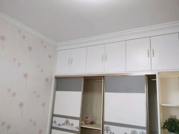 卧室墙面贴满了壁纸,顶面没有做吊顶,贴了石膏线条代替吊顶,效果也蛮不错的哈!衣柜是在定制,质量真不错!