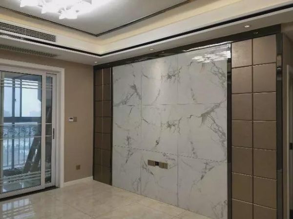 客厅电视背景墙中间贴瓷砖,其实也有点类似大理石的感觉哈!电视墙两边是用硬包做的,贴了金属线条收边,显得更大气,更有档次!楼里一些邻居过来参观都很羡慕呢。