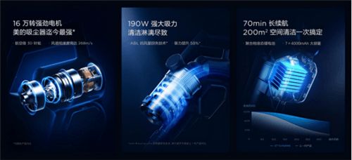 在电机方面,美的Z7配置美的最新研发的威灵电机,采用航空3D叶轮技术,电机转速可达16万转,风道线速度高达268m/s;同时,应用自主研发ABL*抗风量损失技术,可以带来190W强大吸力,吸力对比美的上一代提升58%,有效吸除微尘、细菌和尘螨。不仅如此,为全方位提升产品的清洁性能,在电池方面,美的Z7采用第四代无人机领域聚合物液态锂电池,内含7节4000mAh电池,续航长达70分钟,电池衰减周期明显减少,电池使用寿命更长,一次充满电,可轻松满足最大200平方米大空间全屋清洁。