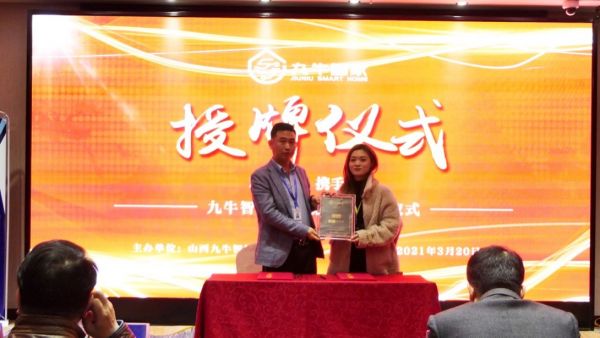 最后,山西九牛智能科技有限公司副总经理梁泽宇为到场的嘉宾详细介绍了九牛智家到底是做什么的,九牛丰富的智能家居产品线,九牛产品质量的保障,同时剖析了行业市场发展潜力无限。更振奋人心的是宣布了辛丑牛年特别推出的九牛智家两大王牌项目,“春季犇行动”和“铁牛看家”,还现场公布了重磅招商政策。